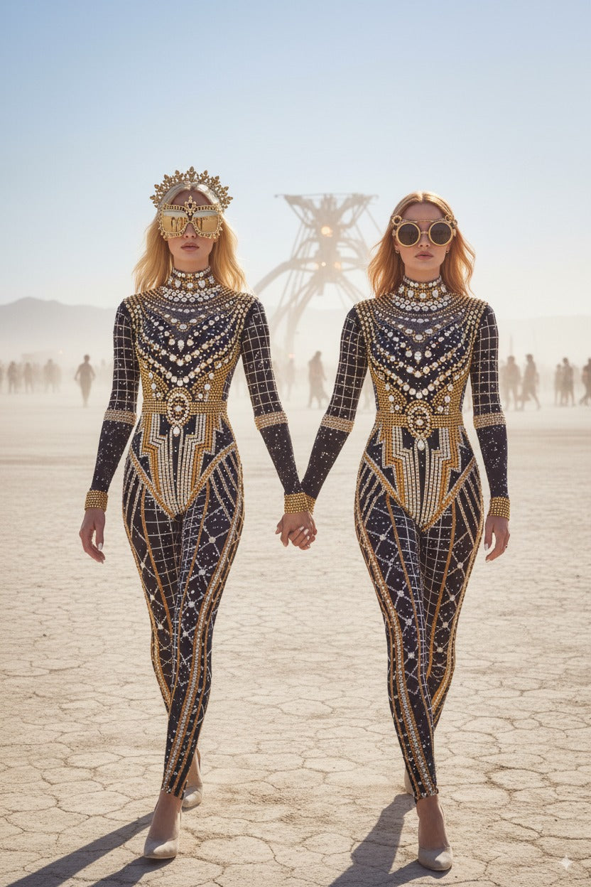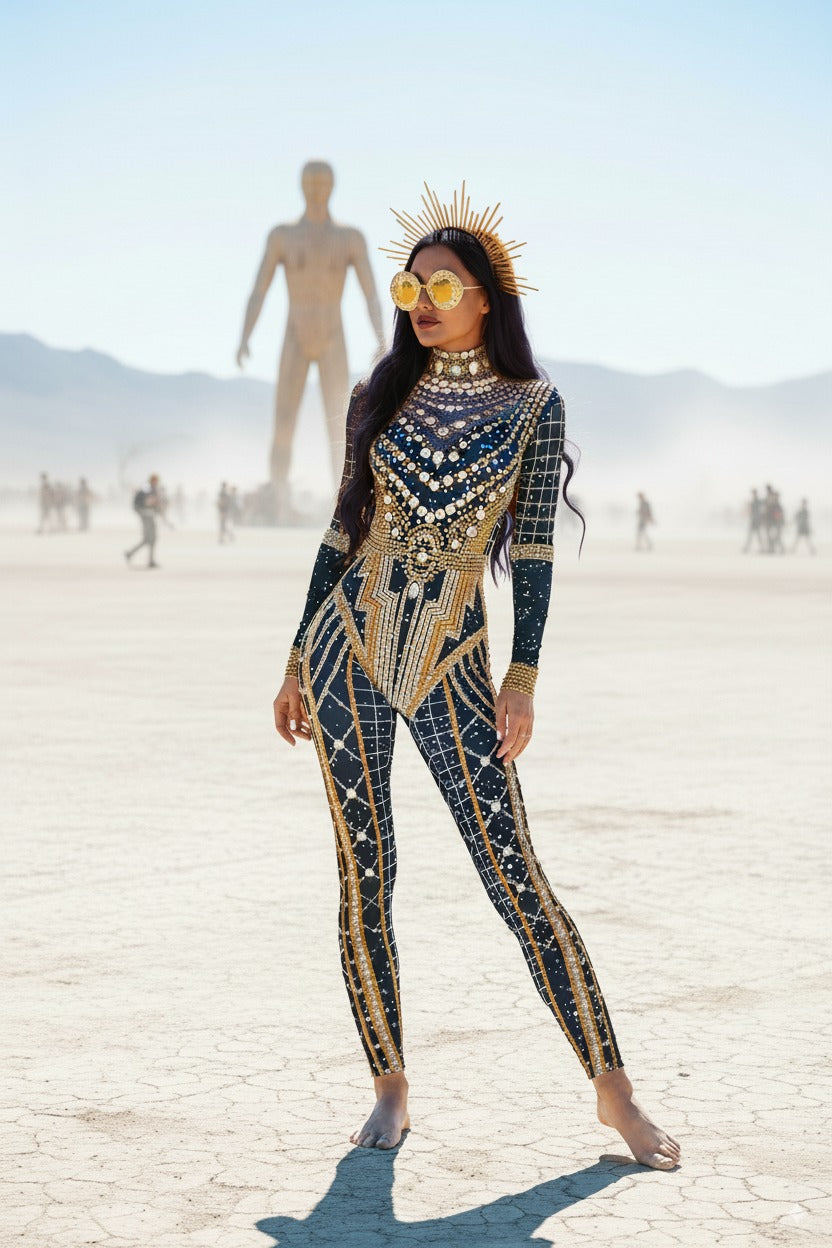 The jumpsuit, in a deep black hue, acts as the perfect canvas for the replica crystal diamonds that adorn the entire garment. Every detail shines with dazzling intensity, spectacularly capturing the light and adding a touch of glamor to your look.